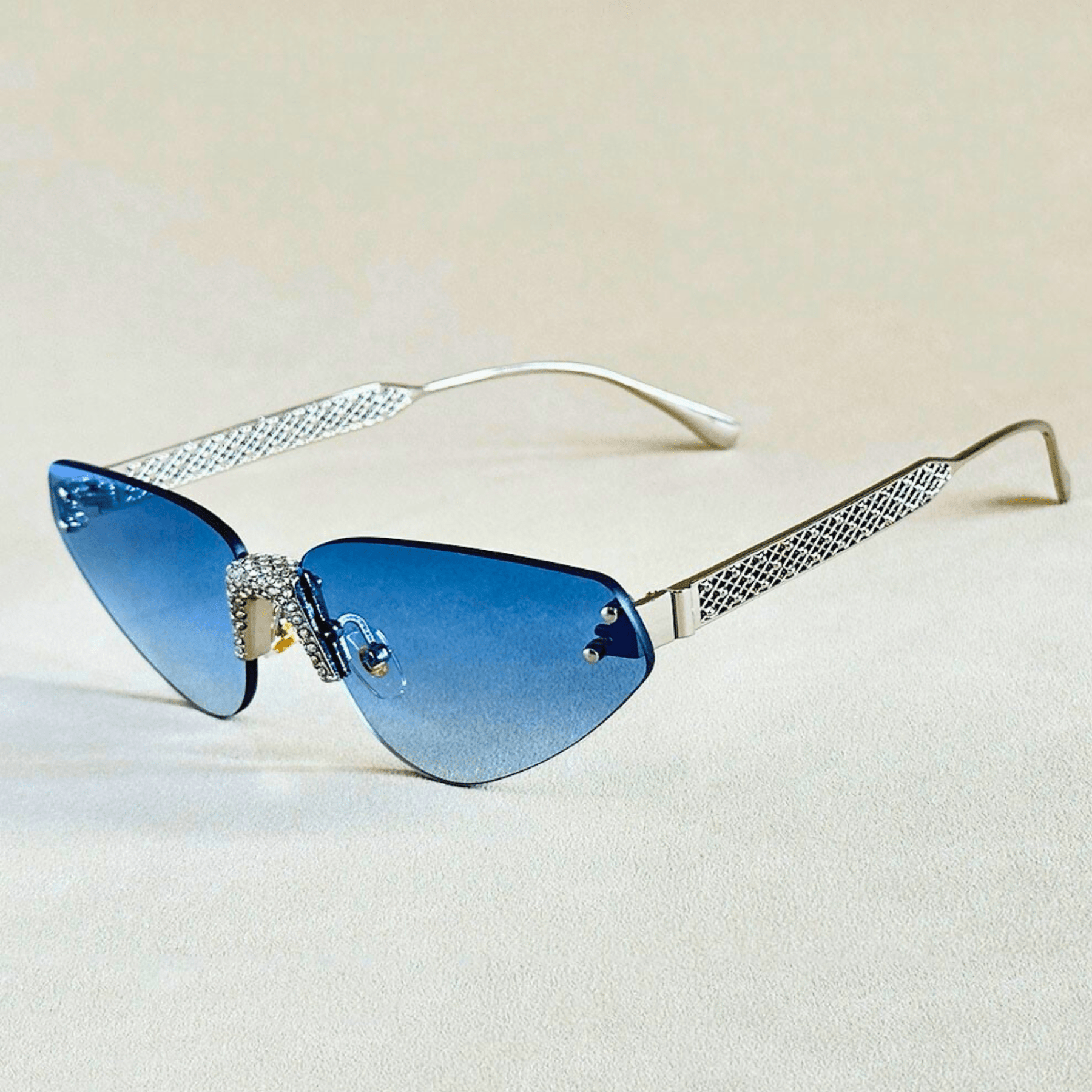 Featuring a bold cat-eye silhouette and a lightweight, rimless frame for a sleek, modern look. Designed with adjustable nose pads, scratch-resistant lenses, and UV400 anti-reflective protection for both fashion and function.